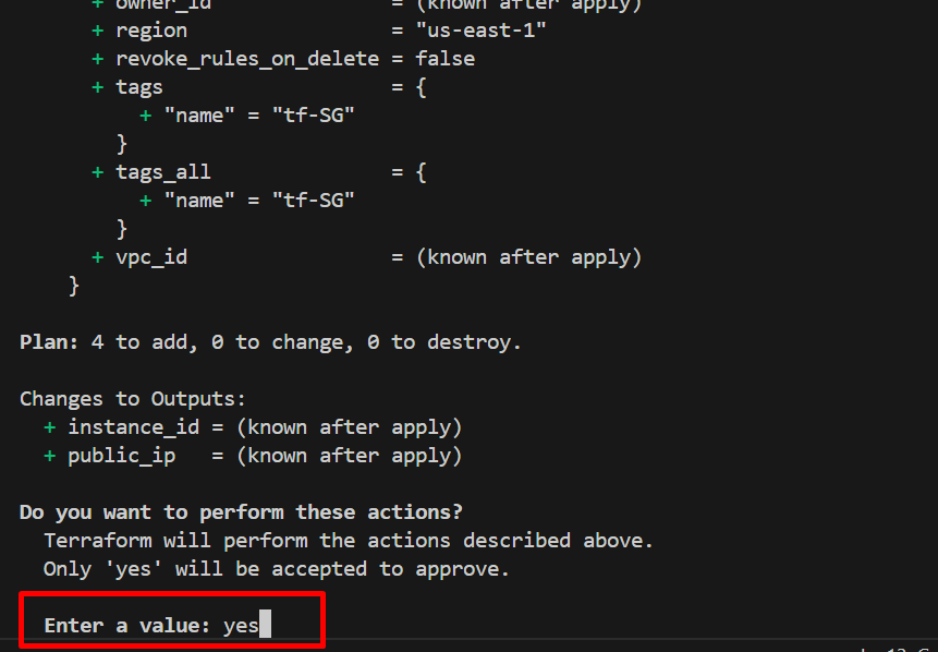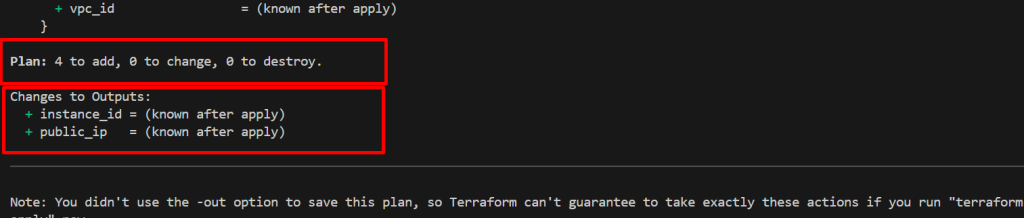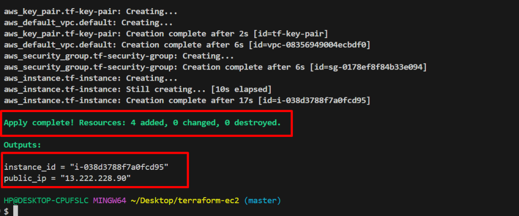 • Once done, Terraform will show you the instance ID and public IP address.